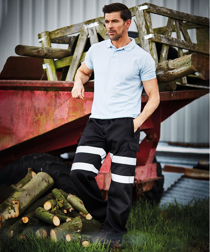Specification Hi Vis Yellow and Orange conforms to EN ISO 20471 Class 1 and Orange is also RIS-3279-TOM Railway use certified. Black and Navy provide enhanced visibility. Made of 280 gsm water-repellent anti-pill single jersey knitted soft-feel polyester fabric. Fully elasticated waist with well-made drawcord. Two 5cm width retro reflective tapes bands higher up to the mid thigh. Cargo pocket with hook and loop fastening flap on both legs. Two Hip pockets with zip closure. One rear patch pocket with hook and loop fastening flap. Elasticated ankles. Comfortable to wear allowing maximum movement without restriction. Washing Instructions Maximum washing temperature 40ºC. Normal process and wash as synthetics. No bleaching allowed. Do not iron. Do not tumble dry or wring. Do not dry clean, cold rinse and short spin. No professional dry cleaning in perchloroethylene or hydrocarbons. Do not wash in biological powder. 25 max. wash cycle.