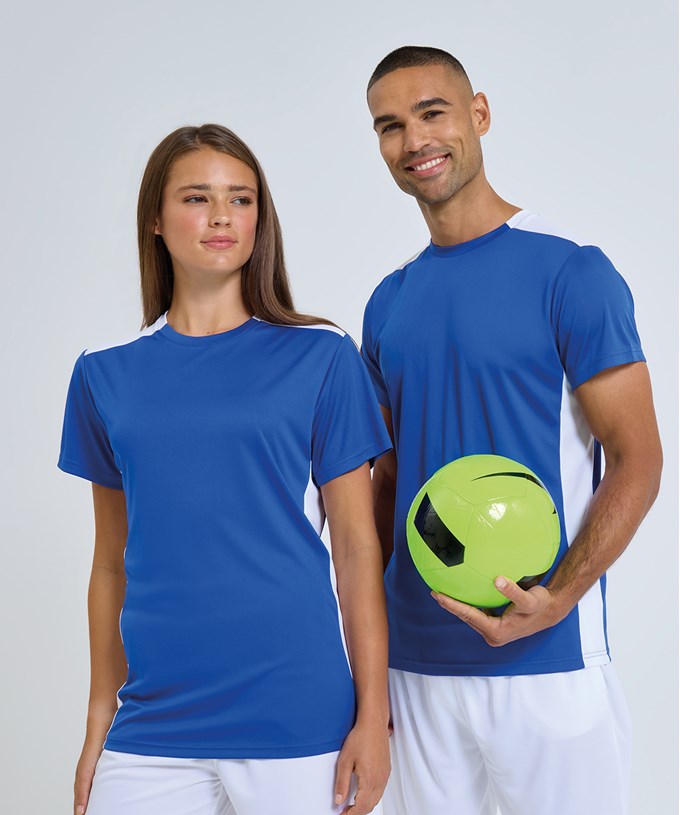 Specification Wicking fabric. Stretch. Crew neck. Short sleeve. Lightweight. Cationic-dyed. Twin-needle stitching on hem and arms. Contrast shoulder and side panels. 100% certified recycled polyester. UPF 40+. Washing Instructions Wash at 40°C